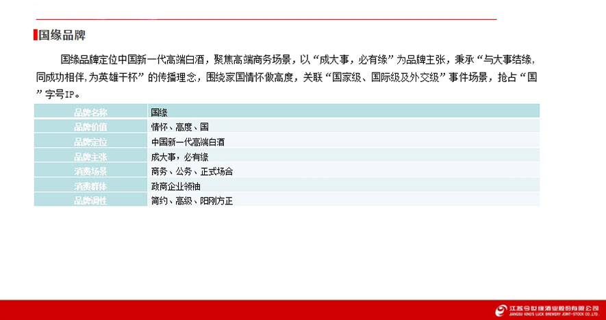 國(guó)緣定位中國(guó)新一代高端白酒,聚焦高端商務(wù),以“成大事,必有緣”為主張,借家國(guó)情懷關(guān)聯(lián)“國(guó)家級(jí)”等場(chǎng)景搶占“國(guó)”字號(hào)IP 。